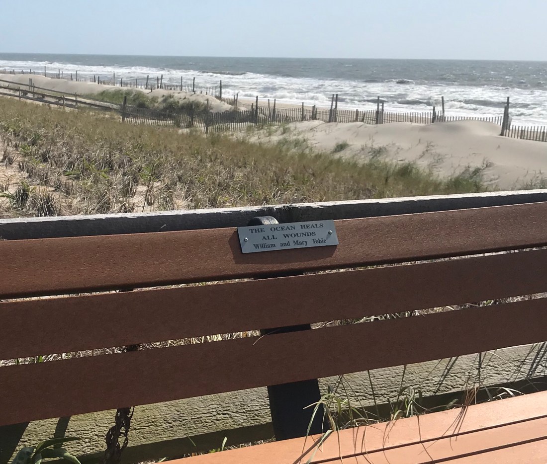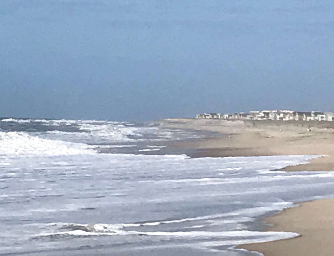 This very shoreline, usually so crowded with people, stood empty except for me and the sandpipers and a pittie, that wanted me to play ball with her. Her owner, high on the dune, called her back to her side. Alone again, the crash of the waves soothed me. I’ve walked for miles and I have miles to get back. Part of me wanted to keep walking south until I could see Atlantic City shimmering in the distance, but I just turned back.